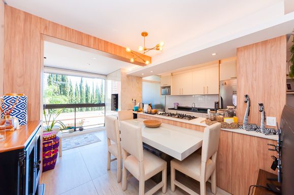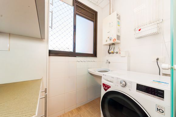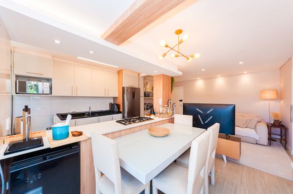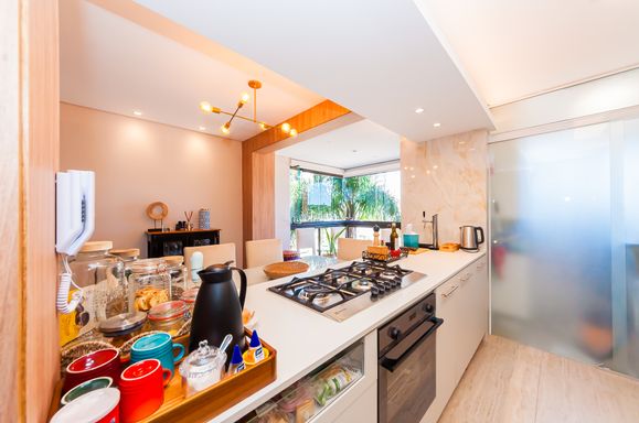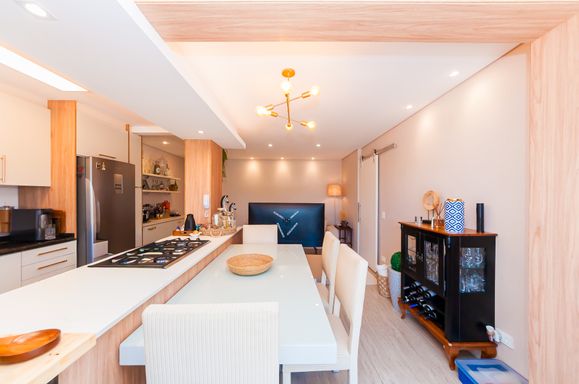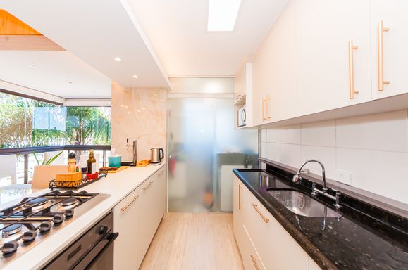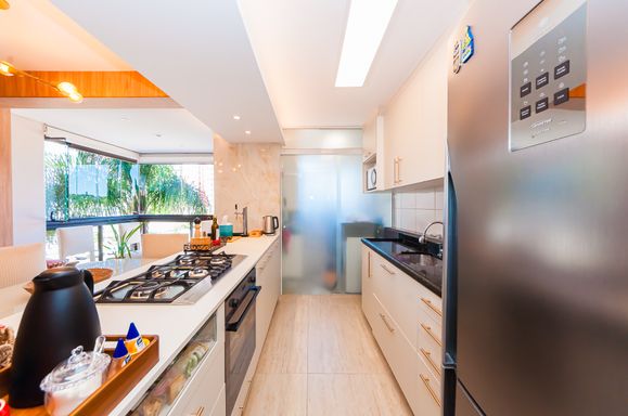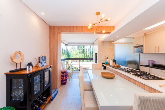 Cozinha americana, a lavanderia separada para otimizar o uso de espaços.