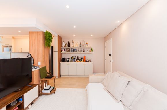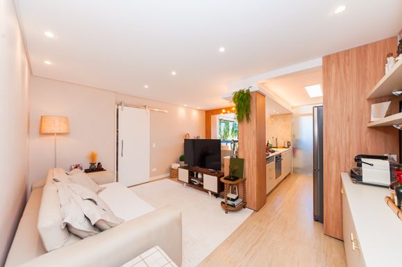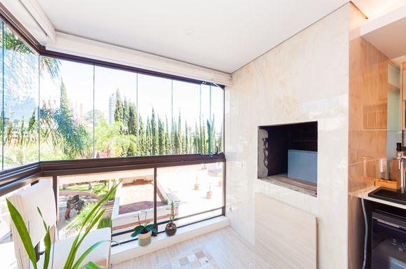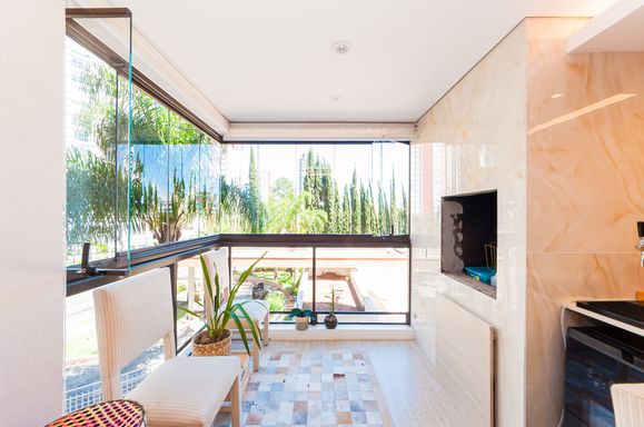 Sala de estar acolhedora integrada à sacada com churrasqueira, proporcionando momentos de lazer.