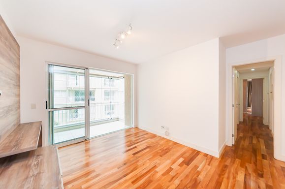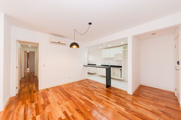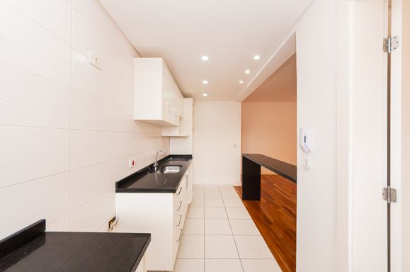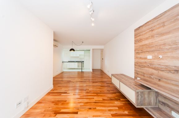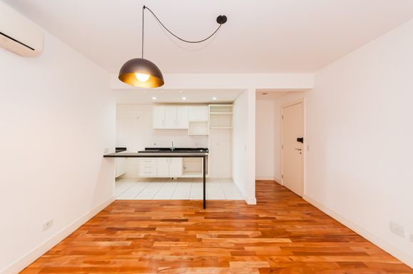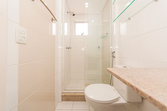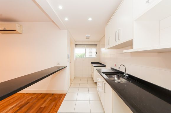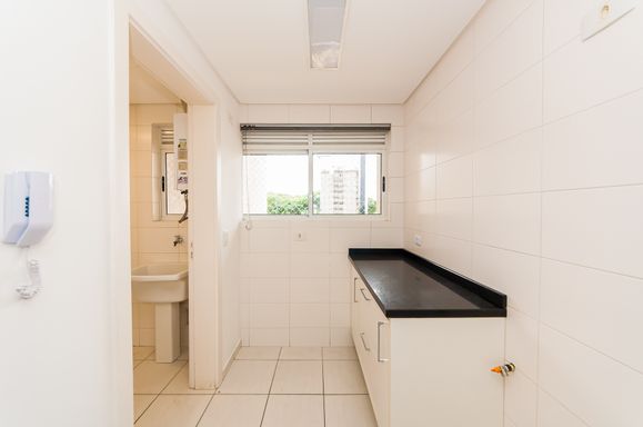 A cozinha conta com bancada funcional e armários planejados, garantindo praticidade no dia a dia. A área de serviço é separada, oferecendo mais organização ao ambiente. O apartamento também dispõe de banheiro social e ar-condicionado instalado na sala.