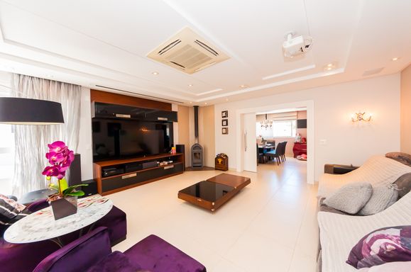 Uma sala de Tv ampla com projetor