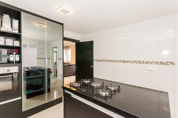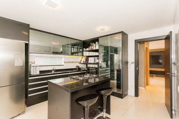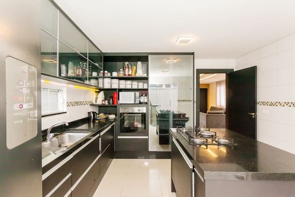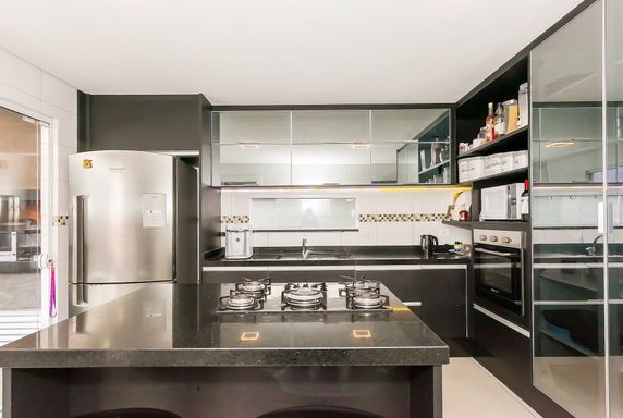 Cozinha moderna e planejada, totalmente equipada com eletrodomésticos modernos;
