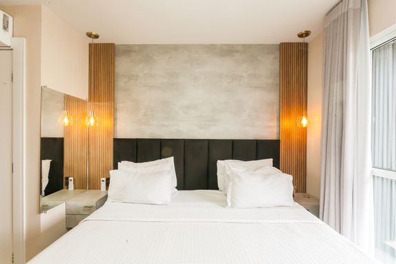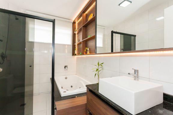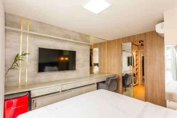Suíte master com eletrodomésticos de última geração, cama espaçosa, penteadeira com poltrona, closet planejado e um banheiro luxuoso com banheira de hidromassagem e sacada com uma vista incrível.