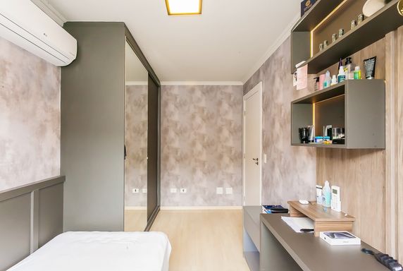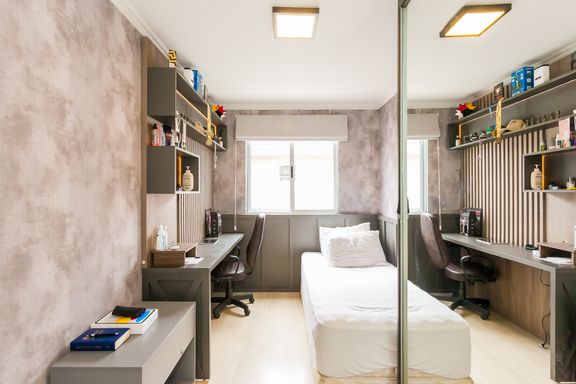 Segundo quarto com cama de solteiro e móveis planejados com espaço para o escritório;