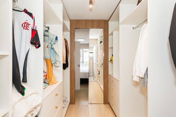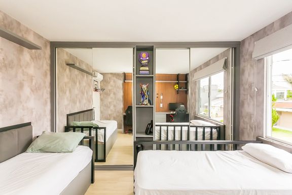 Terceiro quarto com duas camas de solteiro e um amplo armário planejado com espaço para estudos e computadores;