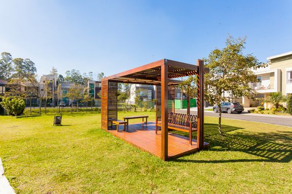 Área gourmet com churrasqueira e mesas, perfeita para receber amigos e familiares;