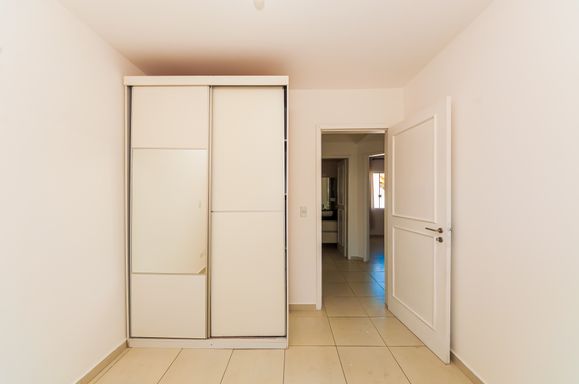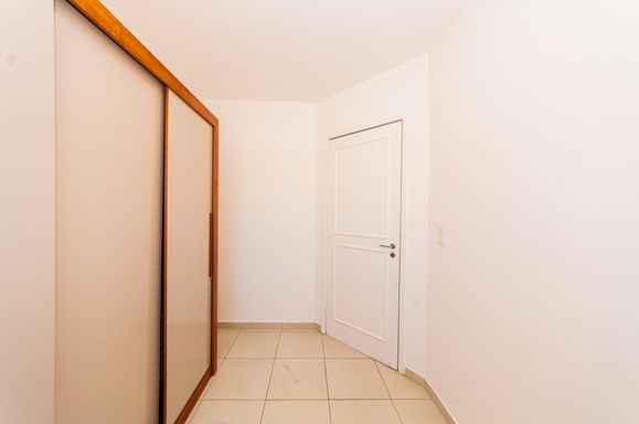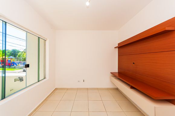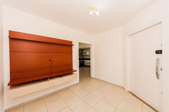Sala de estar com armário e painel para TV; fechadura eletrônica.