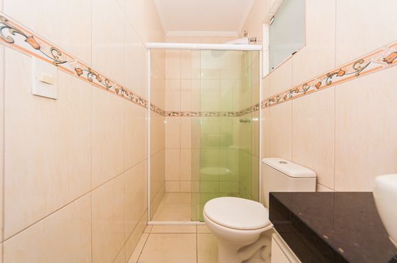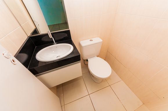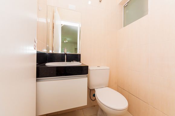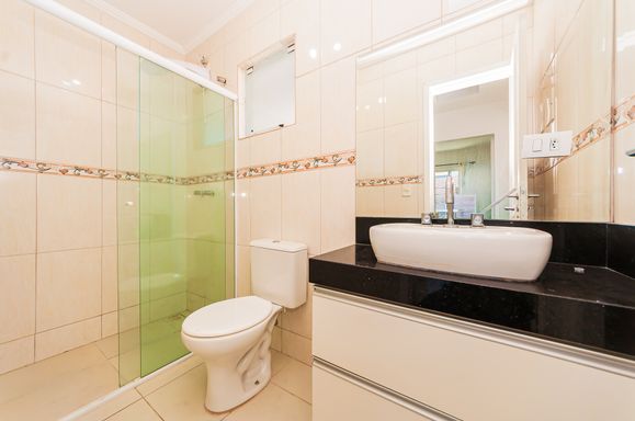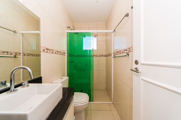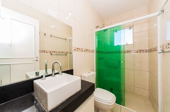 Banheiro social com box em vidro temperado, ducha, espelho, armário embutido, lavatório em porcelana e granito.