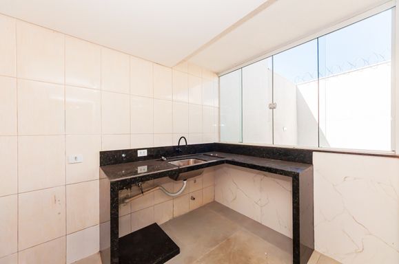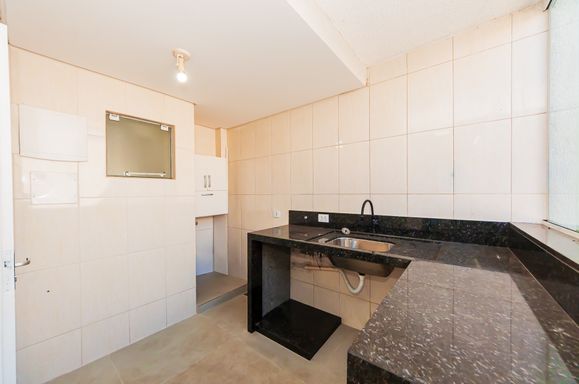 Lavanderia com armário e bancada em granito.