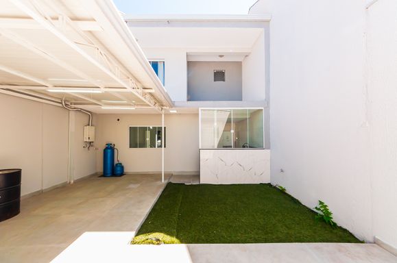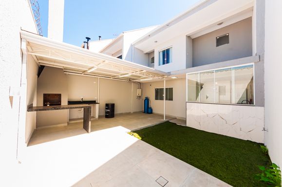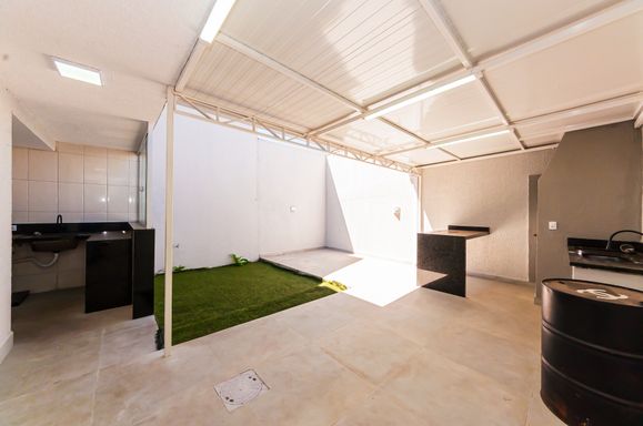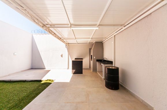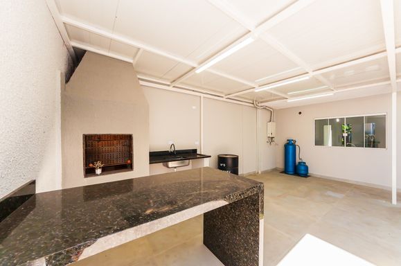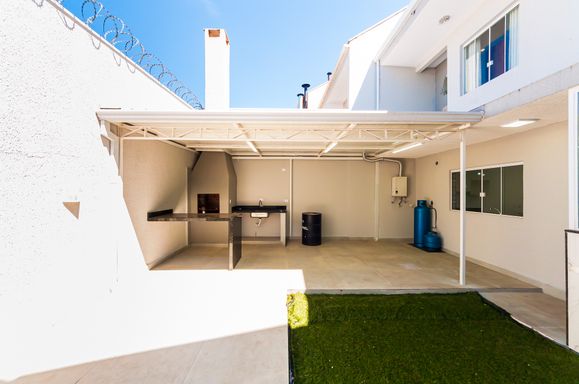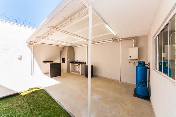 Área gourmet com churrasqueira, jardim e quintal pequeno.