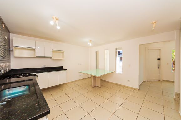 Cozinha planejada ampla com mesa, fogão Electrolux 5 bocas, bancada em granito, pia inox, armários embutidos, piso e revestimento cerâmico; torneira monocomando.